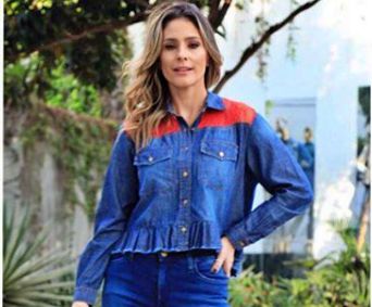 Camisa Jeans Feminina Jeanseria com Renda